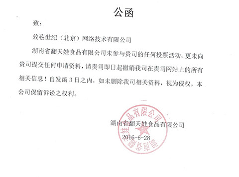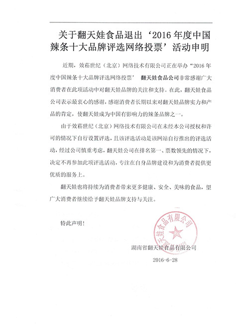 關(guān)于翻天娃食品退出‘2016年度中國辣條十大品牌評選網(wǎng)絡投票’活動申明